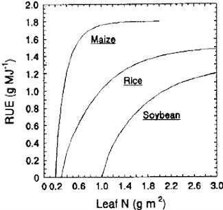 Nilai RUE bervariasi pada masing-masing spesies tanaman tergantung pada kejenuhan cahaya pada laju fotosintesis daun. Tanaman legum (kacang-kacangan) memiliki RUE yang lebih rendah daripada spesies C3 non-legum.
